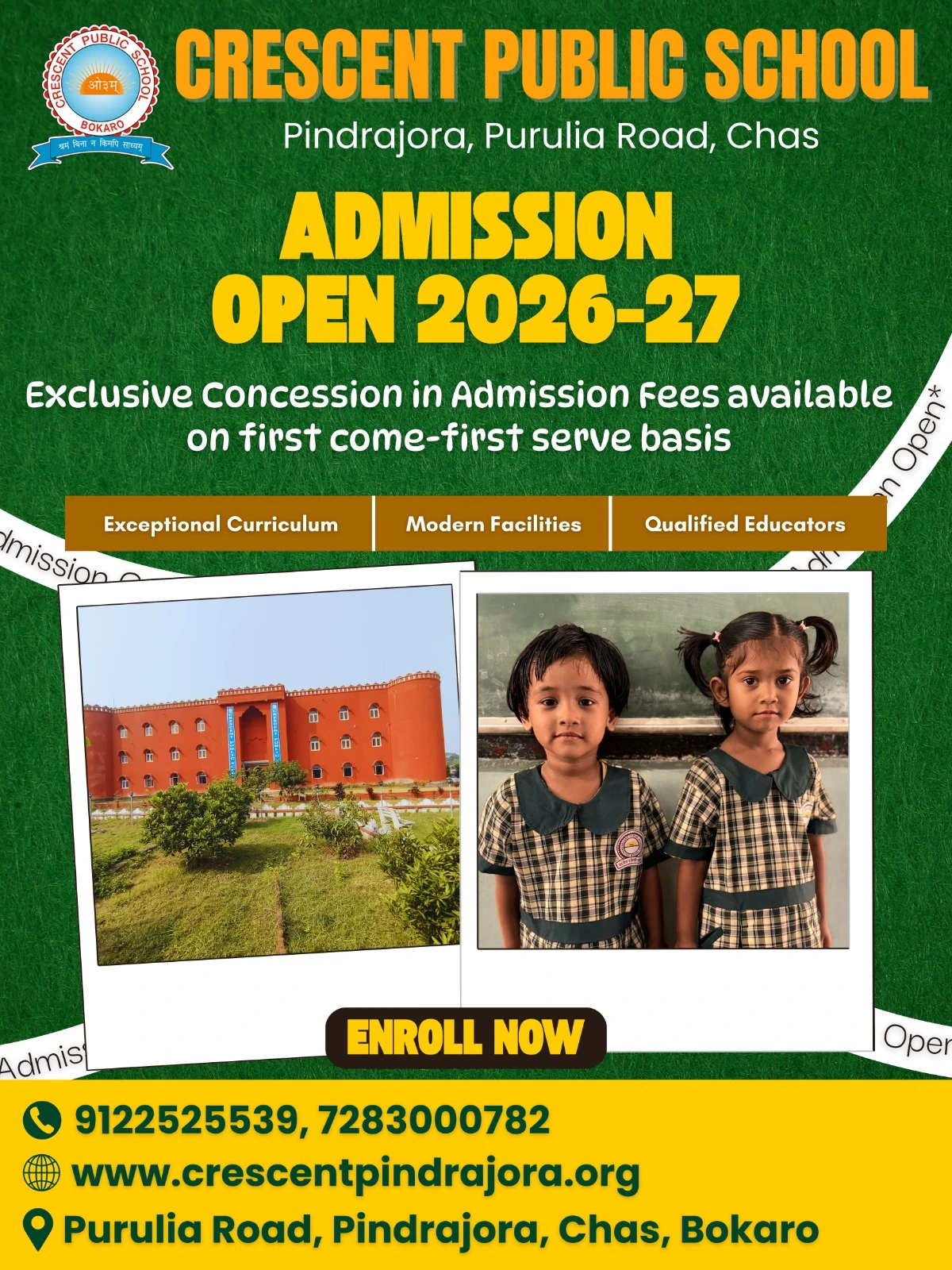 Crescent Public School, an English medium, a Co-ed institution, which follows the curriculum prescribed by CBSE, New Delhi.Crescent Public School, Pindrajora, welcomed its first batch in 2021, offering a unique opportunity to young generations, to pursue quality education, from Nursery to Class 7, and configure ethical values for earning a successful and respectable livelihood.